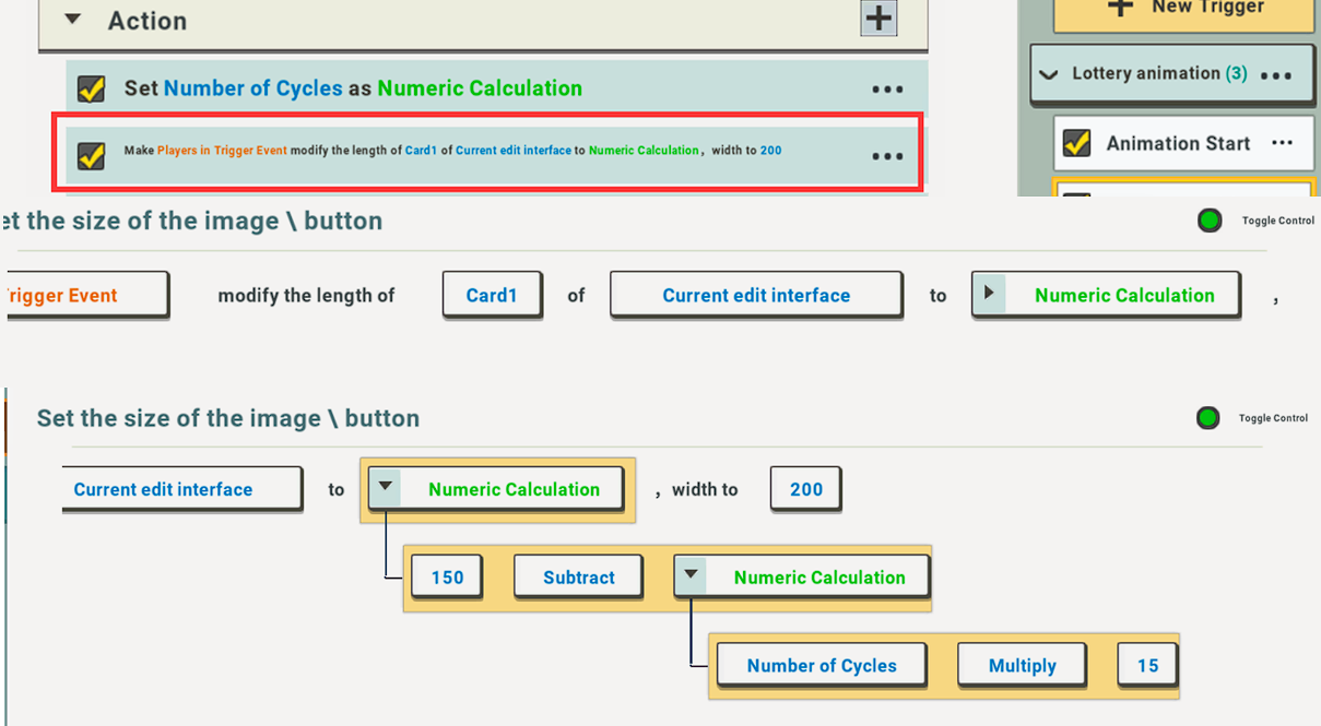 First set a new trigger called “Animation Start” to run when players click the “Lottery Button”, and then set the trigger action as: run “Animation Start”.