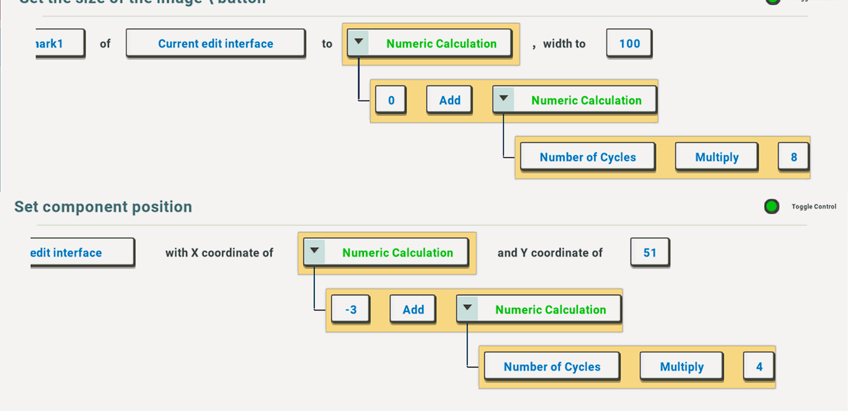 To achieve the flipping effect of the card, we need to reduce the length of the card by one-tenth of its original size for each frame in the animation. Therefore, the next action sets the size of the card component to: 150 - (number of cycles x 15). The algorithm logic is based on the design of the card component, which has a length of 150. Therefore, each reduction is equivalent to one-tenth of 150, while the width remains unchanged. If you want to design components of different sizes, you can use this method to calculate the specific length to be changed for each frame.