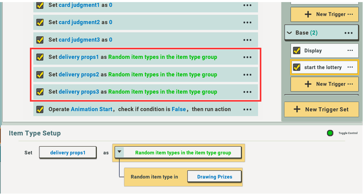 After the setting is complete, add three actions to the initial “Start Lottery” trigger and assign “Card Judgment” to 0 respectively.