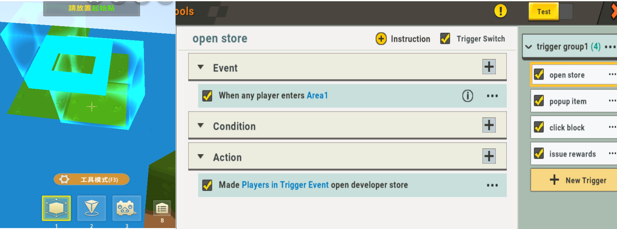 For example, we first create an area with tool F3, then create a new trigger in the trigger interface, and add an event: any player enters area 1; action: make the player who triggers the event open the developer store.