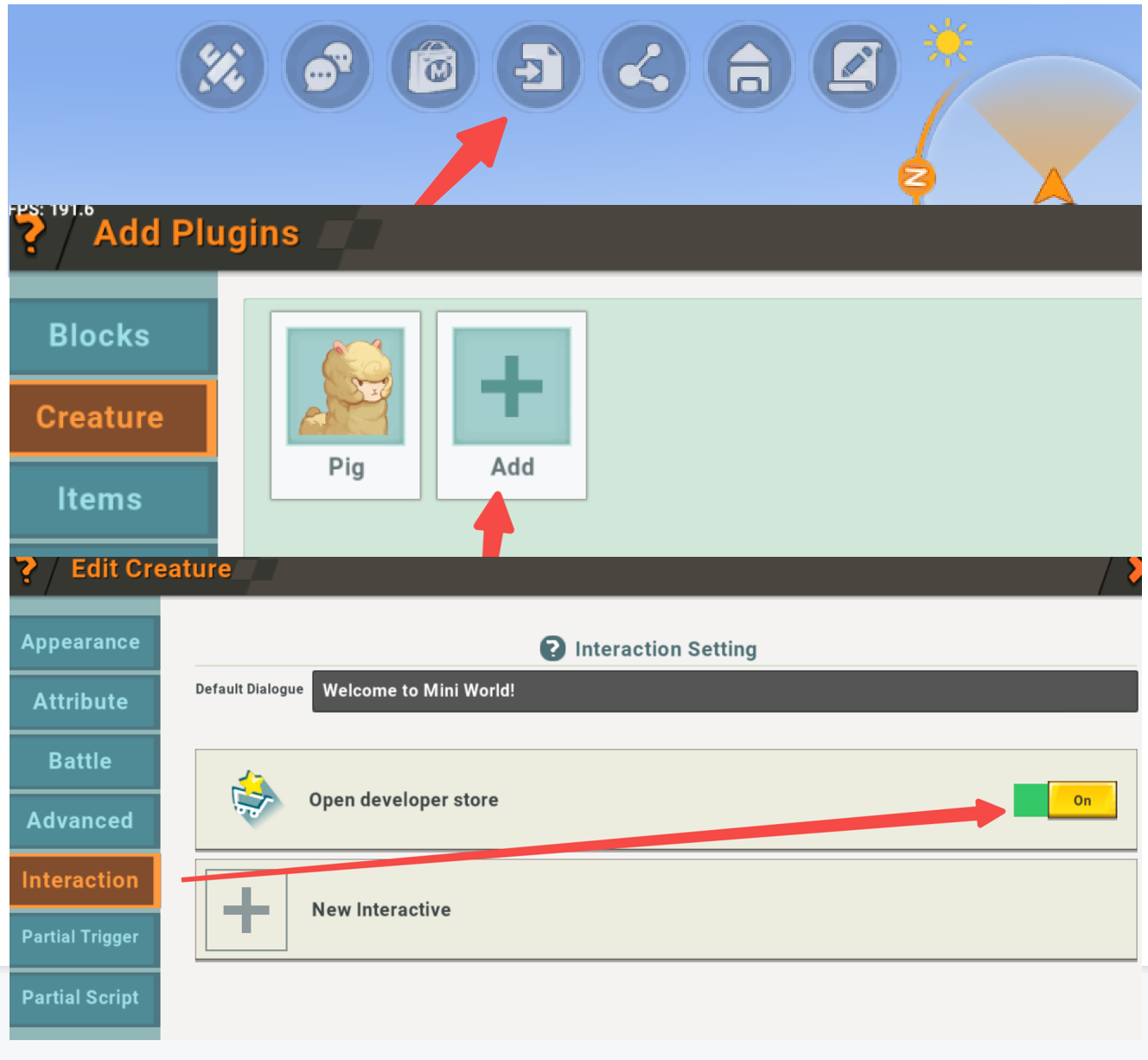 Open the plugin → add a creature → select a model as the creature's appearance → select the “interaction” property → turn on “Open Develop Store”