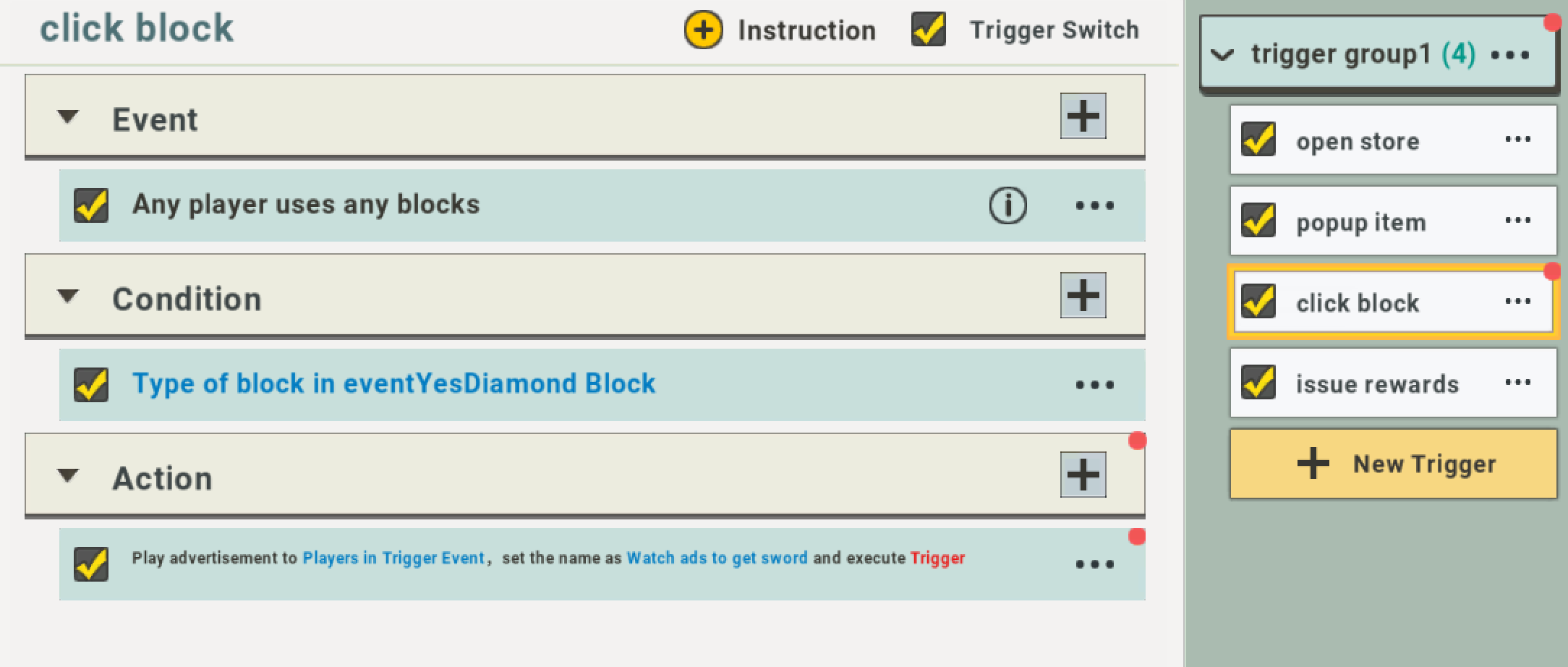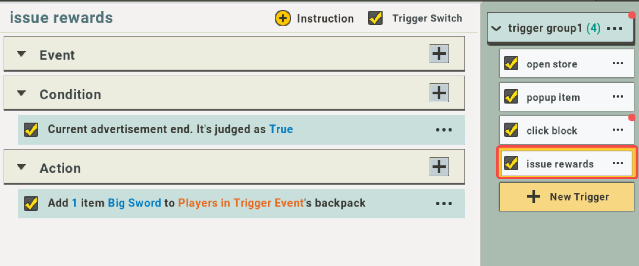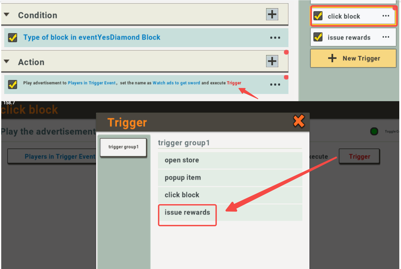 4. Assign the trigger “issue rewards” to the action of the trigger “click block”: and execute.