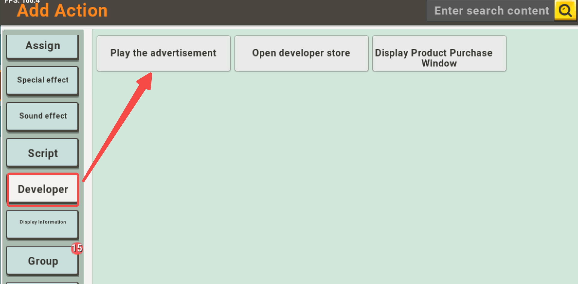 The action of playing ads is found in the developer options: