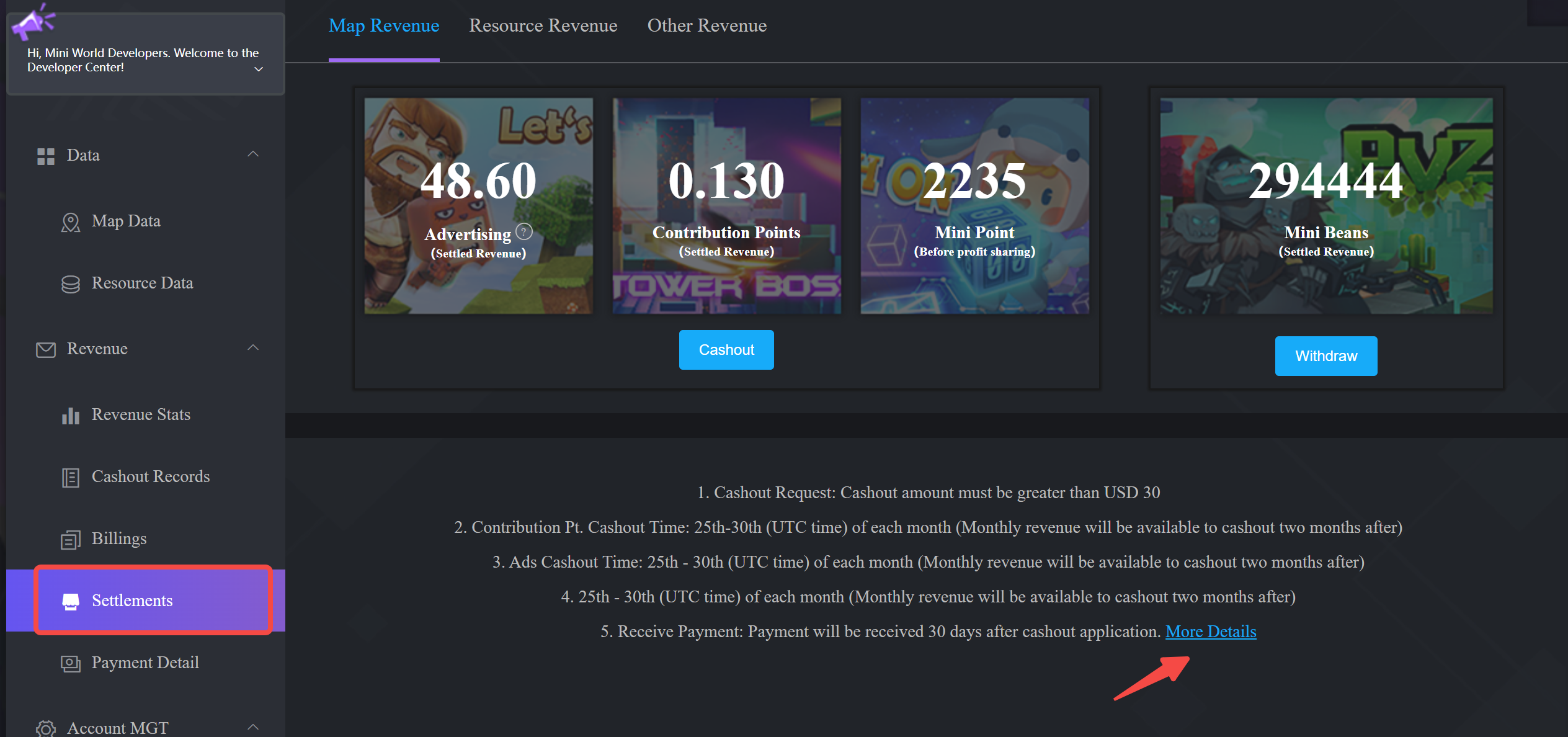 2. Find the Settlement Center → Detailed Description to view the specific rules.