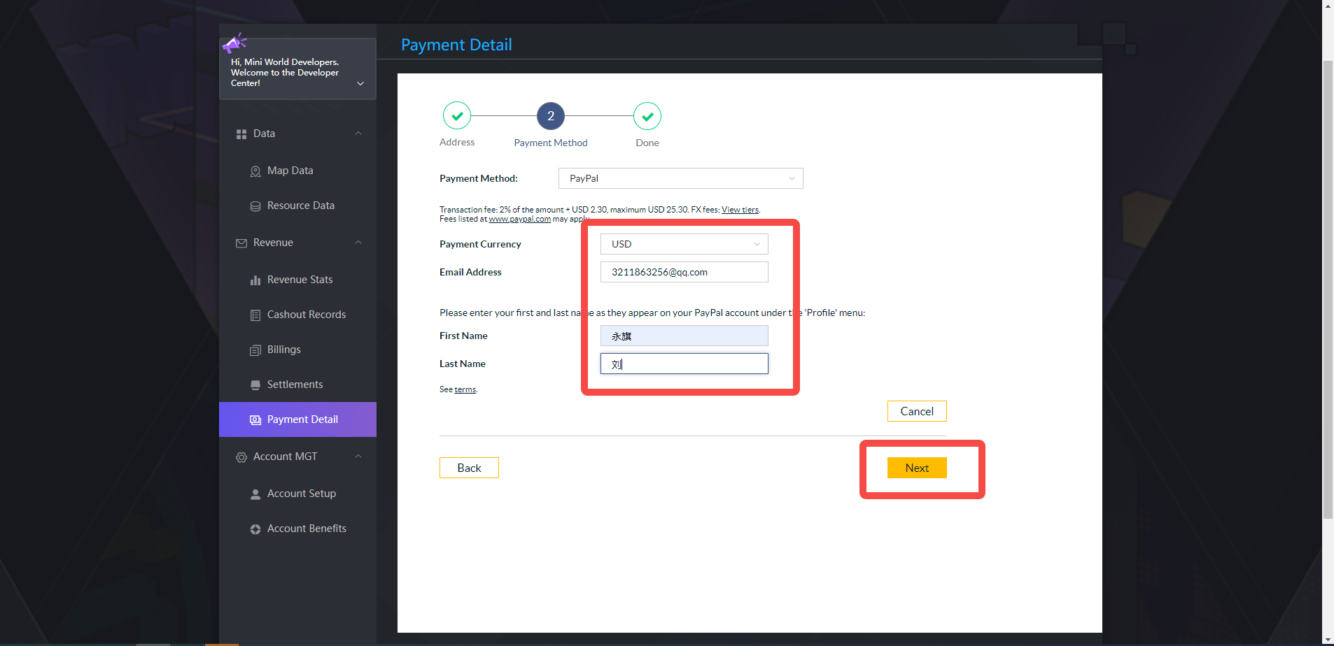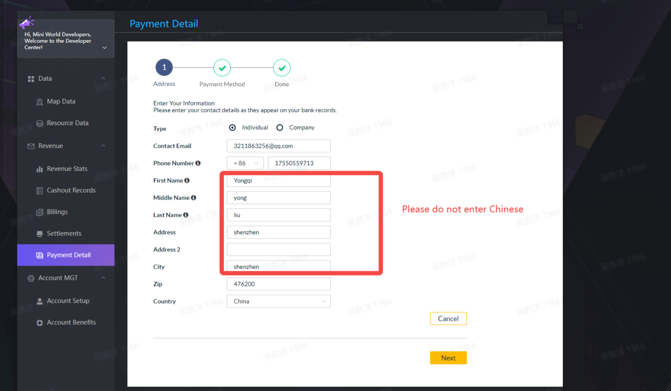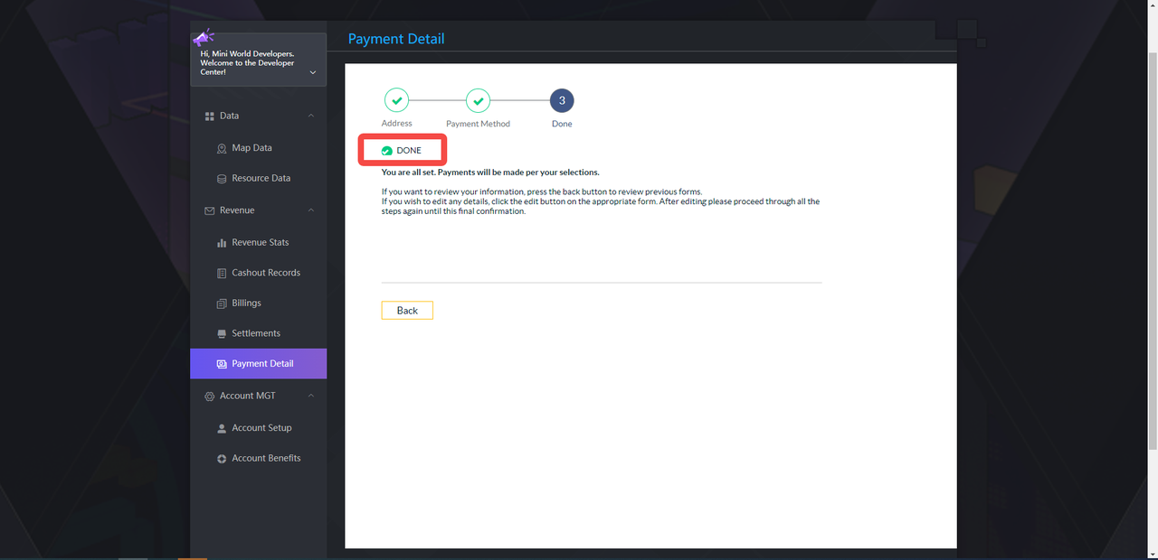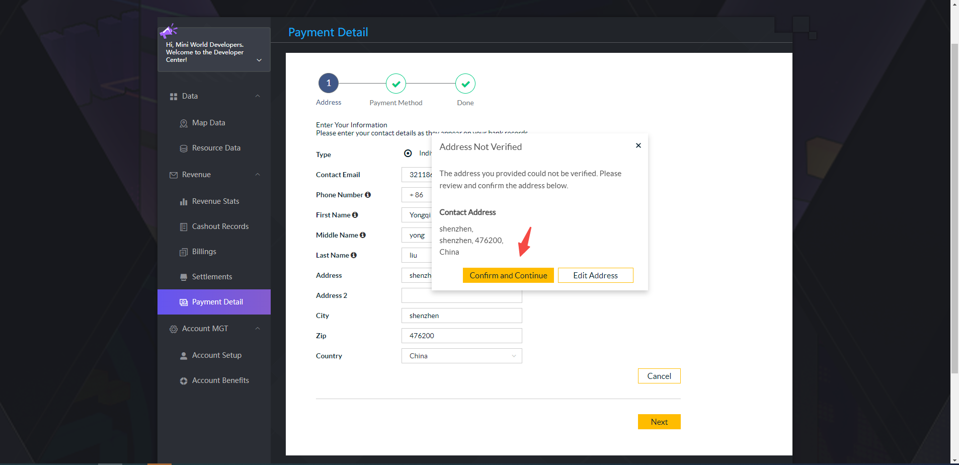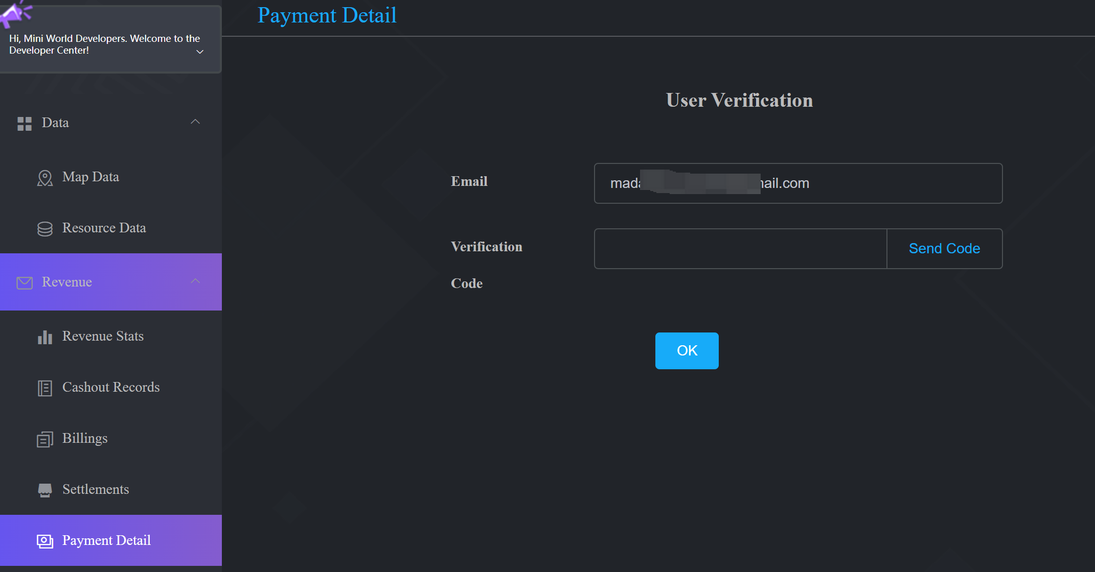 1. Improve the payment information (enter the developer center, click on the left tab [Payment Details], click [Get Verification Code] and enter the email verification code bound to the account.